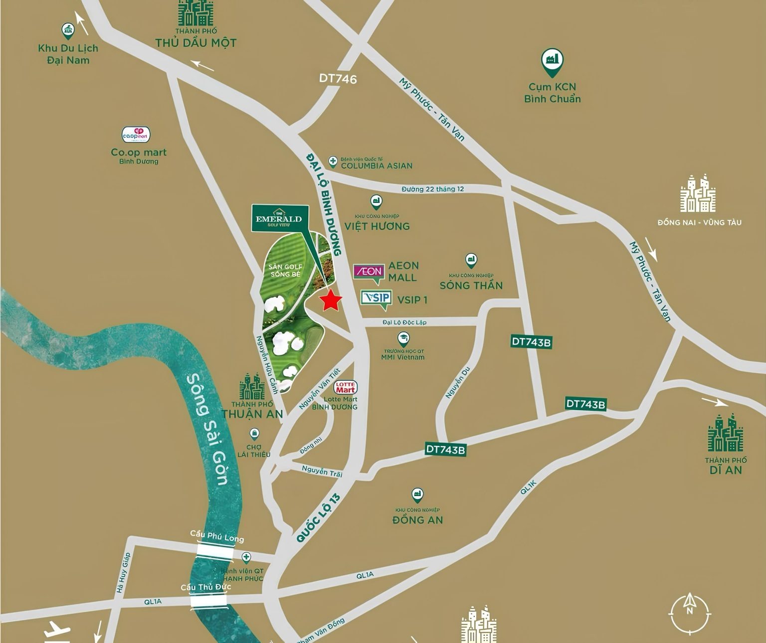 The Emerald Golf View sở hữu vị trí cực kỳ đắc địa ngay Quốc Lộ 13, trục giao thông huyết mạch kết nối Bình Dương – TP.HCM.